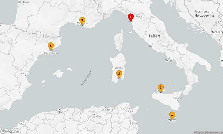 Während Ihrer Kreuzfahrt erkunden Sie unter anderem die Häfen von Livorno, Cagliari und Valletta, die mit spannenden Land- und Kulturerlebnissen auf Sie warten.