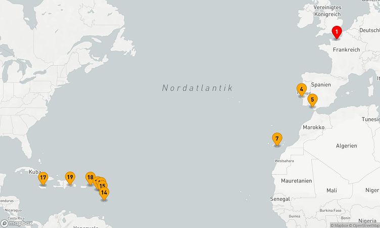 Ihre Reise beginnt am 12. November 2026 in Le Havre (Paris) (Frankreich) und führt Sie über 20 Tage bis zu Ihrem Zielhafen Pointe-à-Pitre (Guadeloupe), wo Sie am 02. Dezember 2026 ankommen.