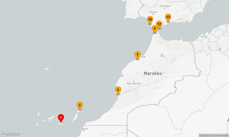 Auf Ihrer Reise besuchen Sie unter anderem die Häfen von Gran Canaria, Arrecife / Lanzarote und Tanger, wo spannende Eindrücke von Land und Kultur auf Sie warten.