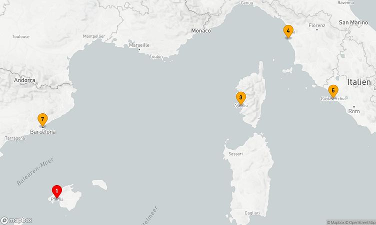 An Häfen wie Palma de Mallorca, Ajaccio (Korsika) und Rom / Civitavecchia haben Sie die Gelegenheit, die Region auf eine besondere Weise kennenzulernen und Neues zu entdecken.