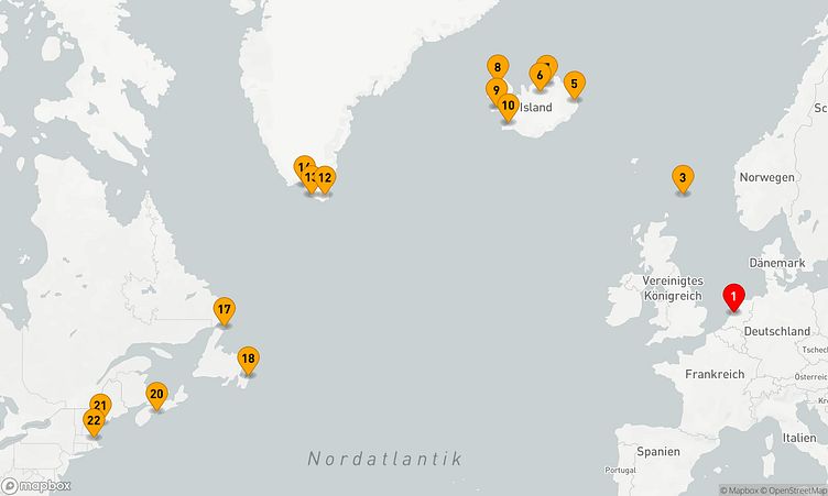 Von Amsterdam (Niederlande) aus brechen Sie am 14. August 2027 auf, um nach 21 Tagen den Zielhafen Boston (Vereinigte Staaten) zu erreichen, wo Ihre Reise endet.