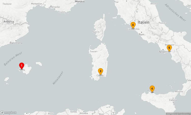 Ihre Route führt Sie zu faszinierenden Häfen wie Palma de Mallorca, Cagliari und Salerno, wo Sie die lokale Atmosphäre und das lebendige Treiben vor Ort erleben können.