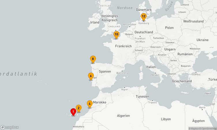 Ihre Reise startet in Gran Canaria (Spanien). Am 27. April 2026 legen Sie ab und erreichen nach 11 Tagen, am 08. Mai 2026, den Zielhafen Hamburg (Deutschland).