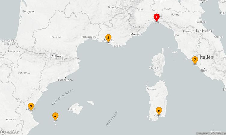 Während Ihrer Reise legen Sie unter anderem in den Häfen von Genua, Marseille und Ibiza an, wo faszinierende Eindrücke von Land und Kultur auf Sie warten.
