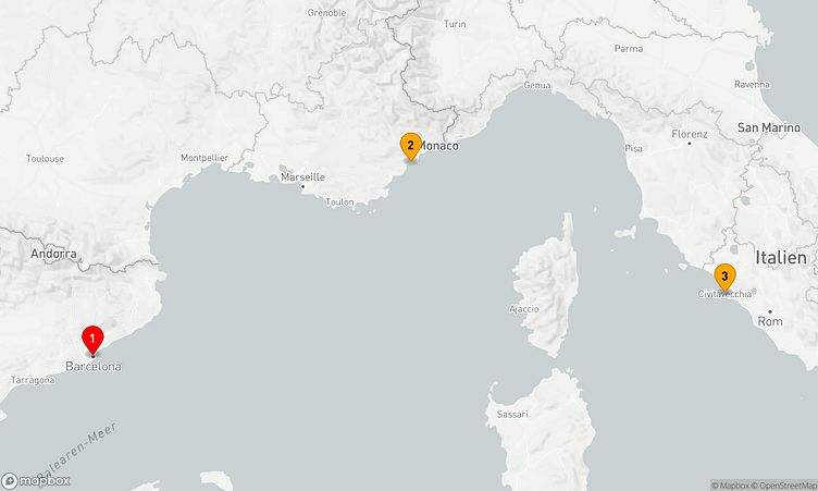 Während dieser Reise erwarten Sie Anläufe in den Häfen von Barcelona, Cannes und Rom / Civitavecchia, wo Sie lokale Highlights entdecken und unvergessliche Eindrücke sammeln können.