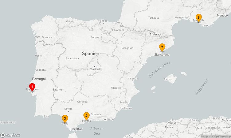 Ihre Reise startet in Lissabon (Portugal). Am 29. April 2026 legen Sie ab und erreichen nach 6 Tagen, am 05. Mai 2026, den Zielhafen Barcelona (Spanien).