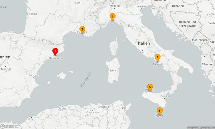 Genießen Sie Anläufe in Häfen wie Barcelona, Marseille und Neapel, die Ihnen authentische Einblicke und besondere Erlebnisse ermöglichen.