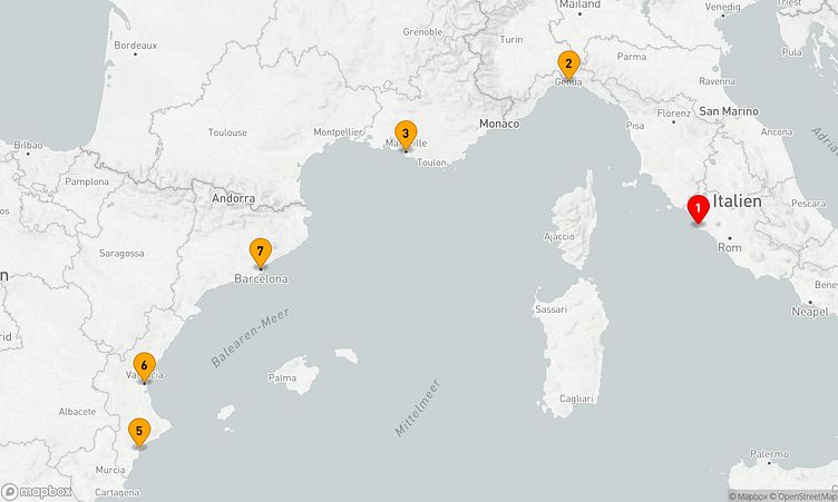 Diese Kreuzfahrt bringt Sie zu den beeindruckenden Häfen von Rom / Civitavecchia, Genua und Alicante, die mit einzigartigen Sehenswürdigkeiten und lebendigen Eindrücken auf Sie warten.