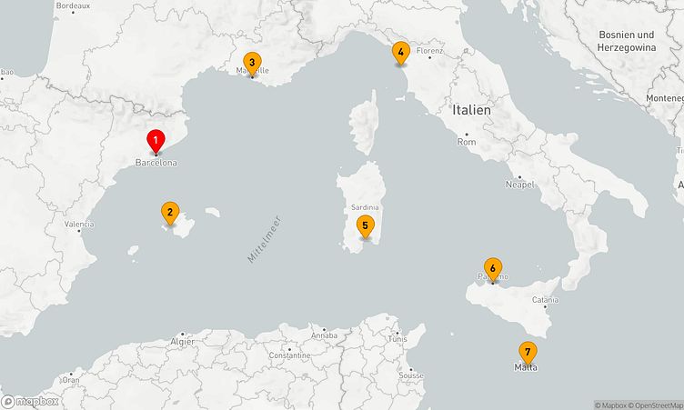 Während Ihrer Reise besuchen Sie unter anderem die Häfen von Barcelona, Palma de Mallorca und Livorno, wo spannende Einblicke in Land und Kultur auf Sie warten.