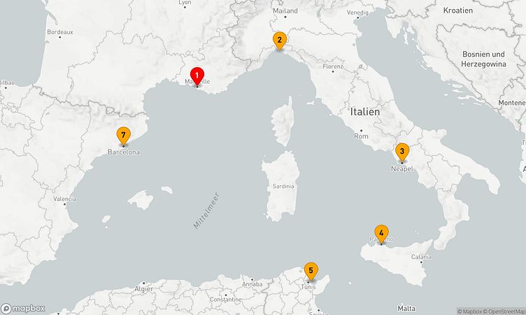 Während Ihrer Reise erwarten Sie Stopps in den Häfen von Marseille, Genua und Palermo, wo Sie lokale Highlights entdecken und unvergessliche Eindrücke gewinnen können.