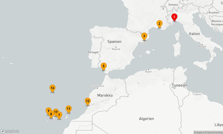 Am 13. Dezember 2025 beginnt Ihre Reise in Savona (Italien), und nach 16 Tagen erreichen Sie am 29. Dezember 2025 den Hafen von Santa Cruz de Tenerife (Spanien).