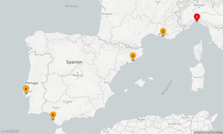 Während der Route halten Sie unter anderem in den Häfen von Genua, Marseille und Cádiz, um in das Flair und die Besonderheiten der Umgebung einzutauchen.