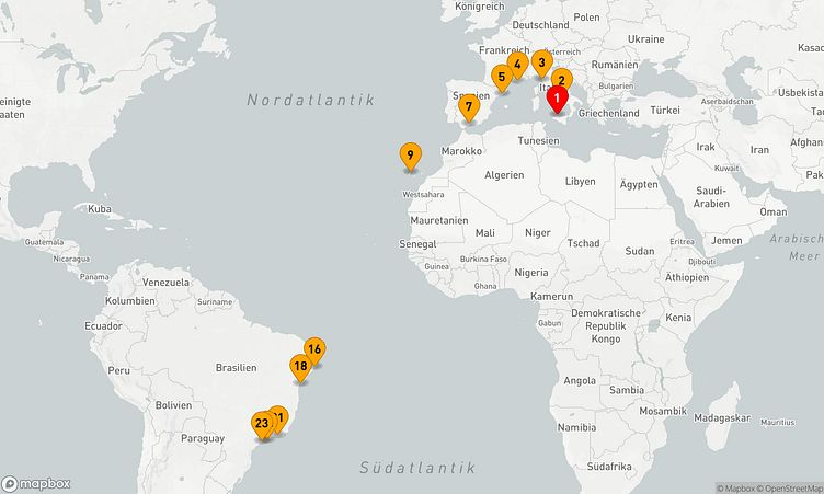 Ihre Reise beginnt in Palermo (Italien). Am 12. November 2027 legen Sie ab und erreichen nach 22 Tagen, am 04. Dezember 2027, den Zielhafen Santos (Brasilien).