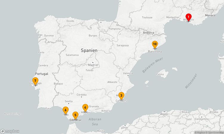 Während Ihrer Reise besuchen Sie unter anderem die Häfen von Marseille, Cartagena (ES) und Gibraltar, wo spannende Einblicke in Land und Kultur auf Sie warten.