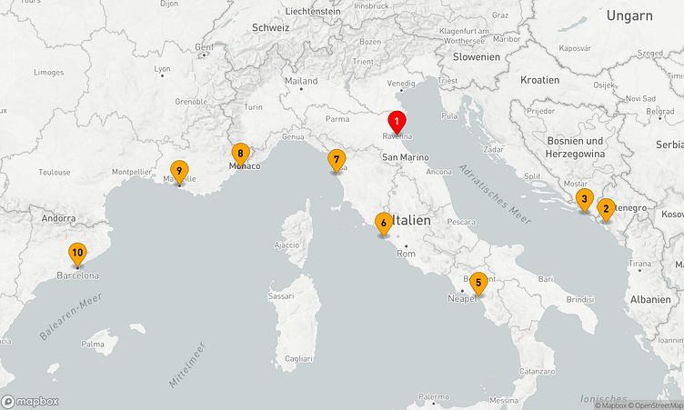 Ihre Route führt Sie unter anderem zu den faszinierenden Häfen von Ravenna, Dubrovnik und Livorno, wo Sie die Atmosphäre und das Leben vor Ort spüren können.