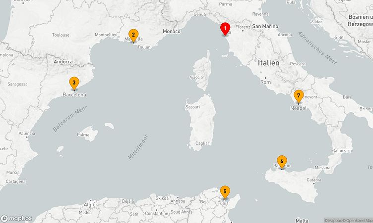Während der Route halten Sie unter anderem in den Häfen von Livorno, Marseille und La Goulette, um in das Flair und die Besonderheiten der Umgebung einzutauchen.