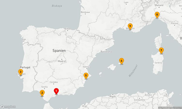 Auf Ihrer Reise besuchen Sie unter anderem die Häfen von Malaga, Lissabon und Olbia, wo spannende Eindrücke von Land und Kultur auf Sie warten.