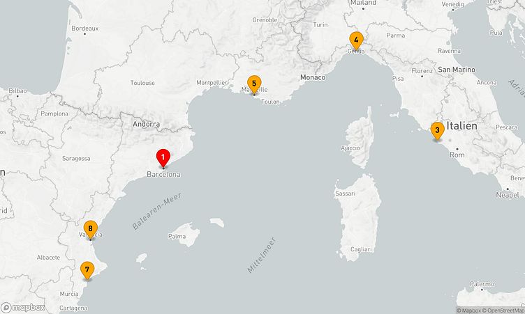 Ihre Route führt Sie unter anderem zu den faszinierenden Häfen von Barcelona, Rom / Civitavecchia und Marseille, wo Sie die Atmosphäre und das Leben vor Ort spüren können.