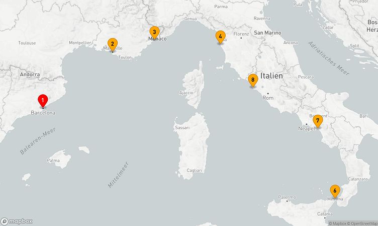 Diese Kreuzfahrt bringt Sie zu den beeindruckenden Häfen von Barcelona, Marseille und Livorno, die mit einzigartigen Sehenswürdigkeiten und lebendigen Eindrücken auf Sie warten.