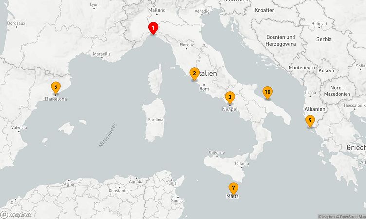 Ihre Route führt Sie unter anderem zu den beeindruckenden Häfen von Genua, Rom / Civitavecchia und Barcelona, wo Sie die lokale Atmosphäre und das lebendige Leben vor Ort erleben können.