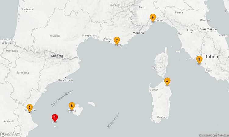 Ihre Reise führt Sie zu den reizvollen Häfen von Ibiza, Valencia und Olbia, wo Sie die lokale Atmosphäre und das lebendige Treiben vor Ort erleben können.