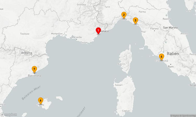Ihre Reise startet in Cannes (Frankreich). Am 19. Oktober 2025 legen Sie ab und erreichen nach 6 Tagen, am 25. Oktober 2025, den Zielhafen Barcelona (Spanien).