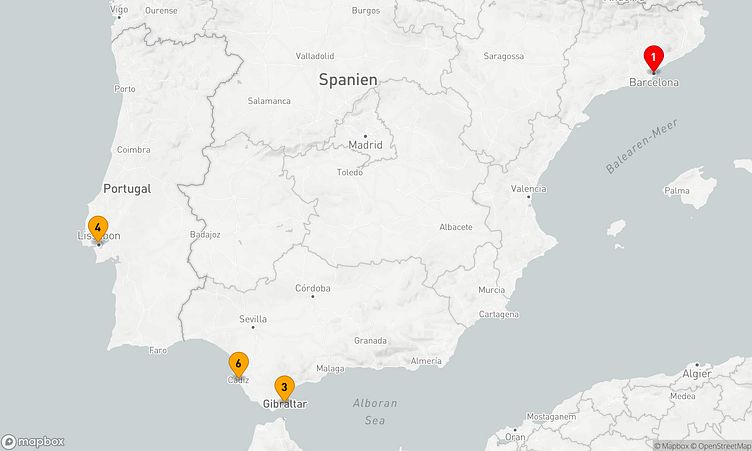 Auf Ihrer Reise besuchen Sie unter anderem die Häfen von Barcelona, Gibraltar und Lissabon, wo spannende Eindrücke von Land und Kultur auf Sie warten.