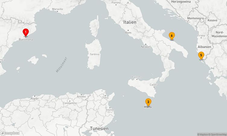Während der Route legen Sie in den Häfen von Barcelona, Valletta und Korfu an, um die besonderen Atmosphären und Eigenheiten dieser Orte zu entdecken.