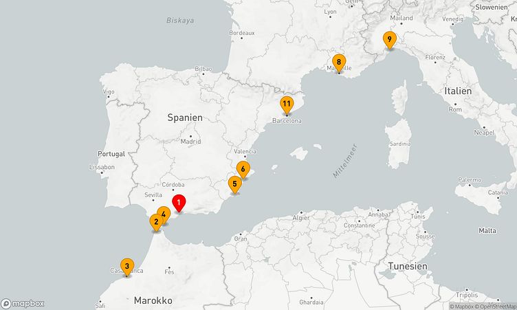 Auf Ihrer Reise besuchen Sie unter anderem die Häfen von Malaga, Casablanca und Alicante, wo spannende Eindrücke von Land und Kultur auf Sie warten.