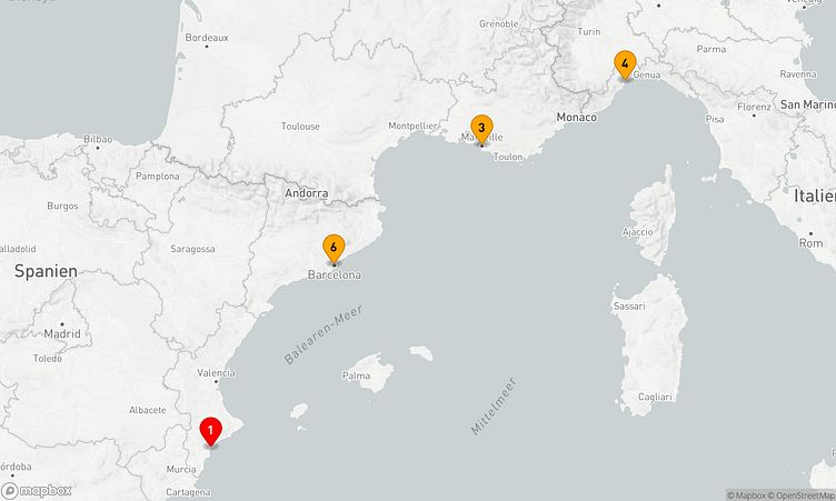Von Alicante (Spanien) aus brechen Sie am 05. November 2025 auf, um nach 5 Tagen den Zielhafen Barcelona (Spanien) zu erreichen, wo Ihre Reise endet.