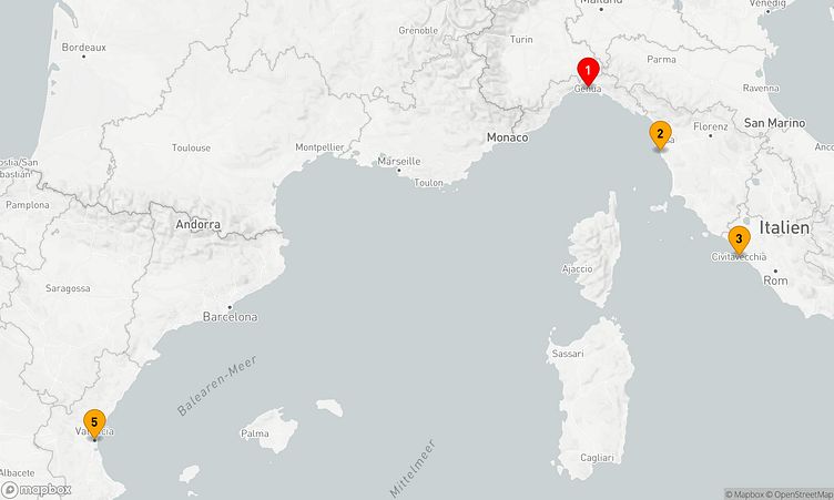 Ihre Reise beginnt in Genua (Italien). Am 21. April 2026 legen Sie ab und erreichen nach 4 Tagen, am 25. April 2026, den Zielhafen Valencia (Spanien).