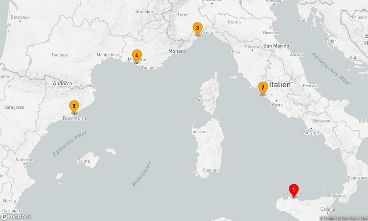 Auf dieser Route erwarten Sie Stopps in den Häfen von Palermo, Rom / Civitavecchia und Marseille, wo Sie lokale Sehenswürdigkeiten und unvergessliche Momente erleben können.