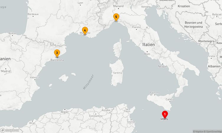 Während Ihrer Reise besuchen Sie unter anderem die Häfen von Valletta, Barcelona und Marseille, wo spannende Einblicke in Land und Kultur auf Sie warten.