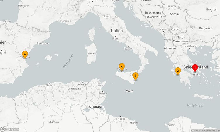 Auf Ihrer Route legen Sie unter anderem in den Häfen von Athen (Piräus), Katakolon und Palermo an, um die einzigartigen Atmosphären und Besonderheiten dieser Orte zu erkunden.