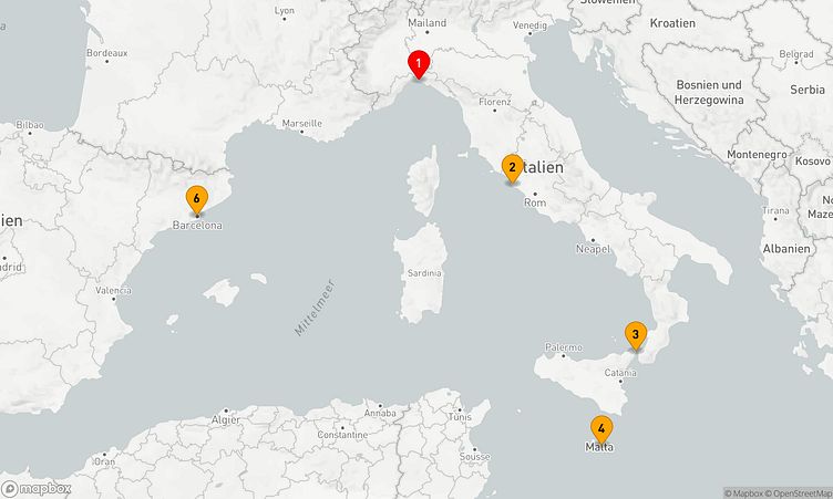 Die Reiseroute startet am 12. April 2026 in Genua (Italien) und endet am 17. April 2026 (5 Tage) in Barcelona (Spanien).