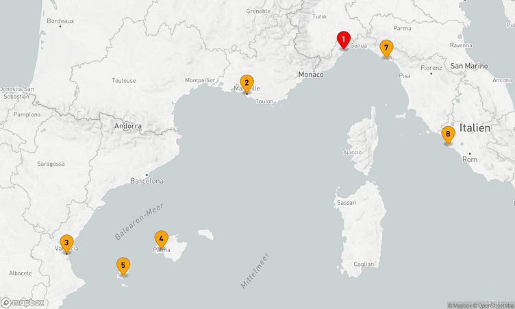 Während Ihrer Reise legen Sie unter anderem in den Häfen von Savona, Valencia und Palma de Mallorca an, wo spannende Einblicke in Land und Kultur auf Sie warten.