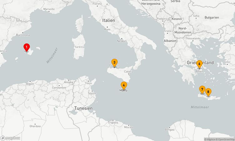 Freuen Sie sich auf Anläufe in Häfen wie Palma de Mallorca, Palermo und Athen (Piräus), die Ihnen authentische Einblicke und besondere Erlebnisse bieten.