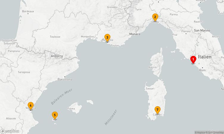 Auf dieser Route erwarten Sie Stopps in den Häfen von Rom / Civitavecchia, Genua und Valencia, wo Sie lokale Highlights entdecken und unvergessliche Eindrücke sammeln können.