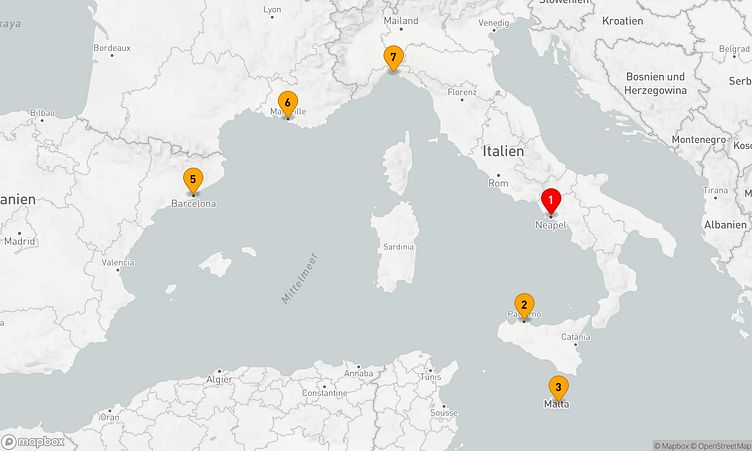 Ihre Route führt Sie unter anderem zu den faszinierenden Häfen von Neapel, Palermo und Barcelona, wo Sie die Atmosphäre und das Leben vor Ort spüren können.
