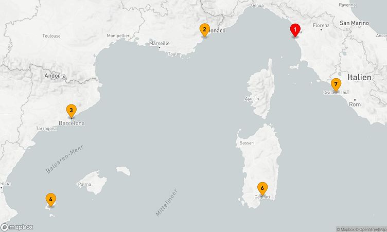 Nach Ihrem Start am 13. April 2027 in Livorno (Italien) führt Sie die Route über 7 Tage bis zu Ihrem Zielhafen Livorno (Italien), wo Sie am 20. April 2027 ankommen.