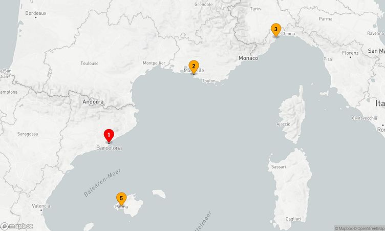 Während der Route besuchen Sie unter anderem die Häfen von Barcelona, Marseille und Savona, um in das lokale Flair und die Besonderheiten der Regionen einzutauchen.
