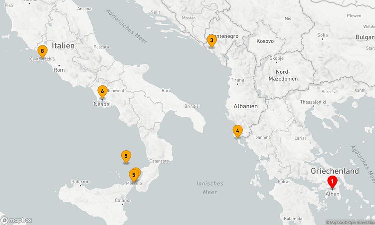 Während der Reise besuchen Sie unter anderem die Häfen von Athen (Piräus), Korfu und Messina, die Ihnen spannende Eindrücke und einzigartige Entdeckungen bieten.
