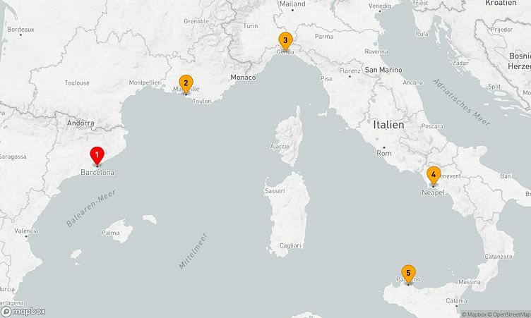 Auf Ihrer Route machen Sie Halt in den Häfen von Barcelona, Marseille und Neapel, um die einzigartige Atmosphäre und die Besonderheiten der jeweiligen Umgebung zu entdecken.
