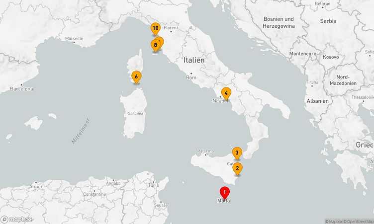 Während der Reise besuchen Sie unter anderem die Häfen von Valletta, Syrakus und Amalfi, die Ihnen spannende Eindrücke und einzigartige Entdeckungen bieten.
