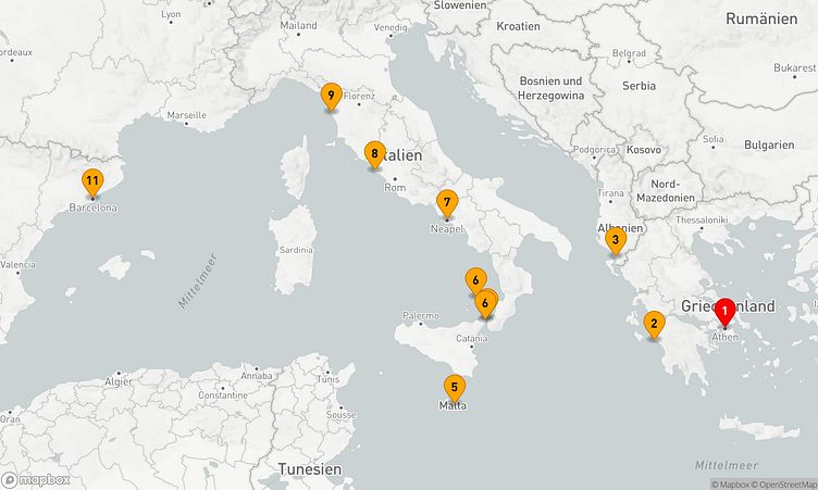 Auf dieser Route erwarten Sie Stopps in den Häfen von Athen (Piräus), Sarande und in der Straße von Messina, wo Sie lokale Highlights entdecken und unvergessliche Eindrücke sammeln können.