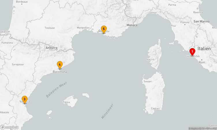 Die Reiseroute startet am 05. Februar 2026 in Rom / Civitavecchia (Italien) und führt Sie vom 05. Februar 2026 bis zum 09. Februar 2026 (4 Tage) nach Marseille (Frankreich).