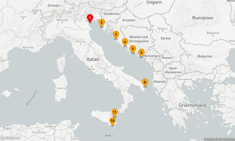 Am 22. September 2026 beginnt Ihre Reise in Venedig (Italien), und nach 10 Tagen erreichen Sie am 02. Oktober 2026 den Hafen von Catania (Italien).