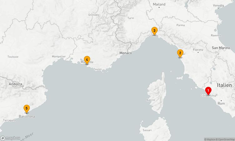 Ihre Route führt Sie zu faszinierenden Häfen wie Rom / Civitavecchia, Livorno und Marseille, wo Sie die lokale Atmosphäre und das lebendige Treiben vor Ort hautnah erleben können.