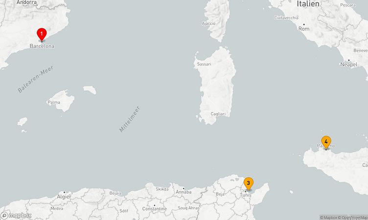 Während Ihrer Reise legen Sie unter anderem in den Häfen von Barcelona, La Goulette und Palermo an, wo Sie spannende Einblicke in Land und Kultur erwarten.