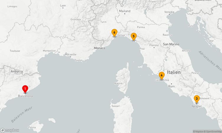Auf Ihrer Route besuchen Sie unter anderem die Häfen von Barcelona, - und Neapel, wo faszinierende Eindrücke von Land und Kultur auf Sie warten.